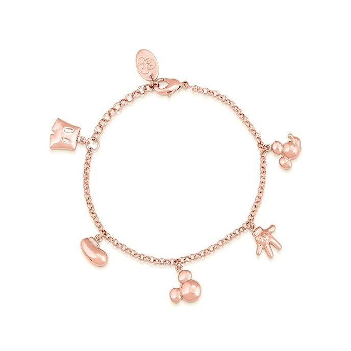 Les fidèles fans de Disney peuvent célébrer le 90e anniversaire de Mickey Mouse avec toute l’élégance de ce bracelet à breloques. Sa délicate chaîne plaquée or rose 14 carats est ornée de 5 irrésistibles breloques à l’effigie des inimitables incontournables du style de la souris.