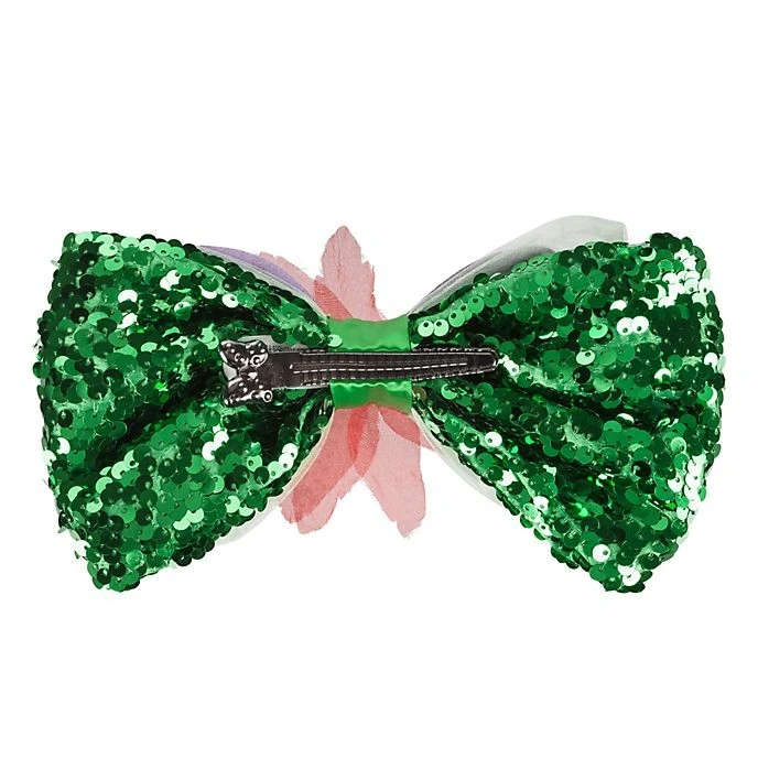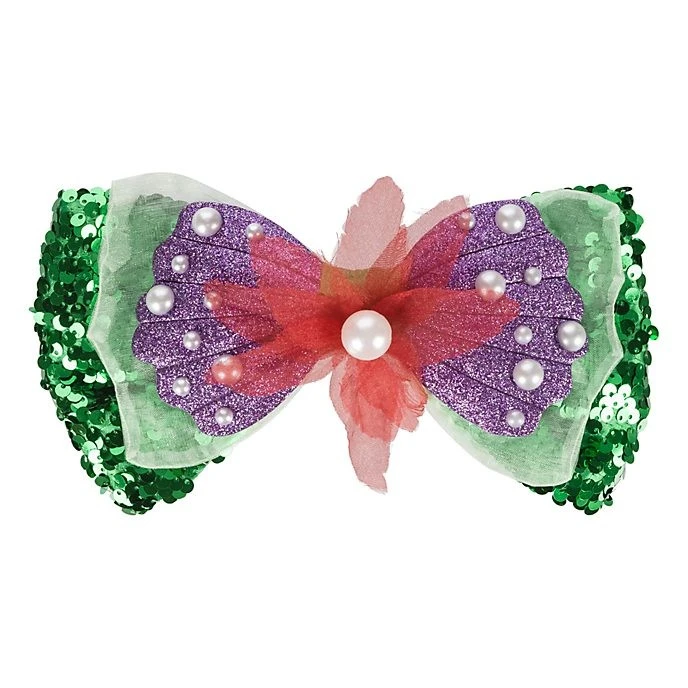 Avec ce noeud Ariel, les petites sirènes peuvent adopter un look flamboyant en accessoirisant leur serre-tête à oreilles Minnie ou bien en sen servant comme barrette à cheveux. Il se compose de sequins scintillants, de perles nacrées et dun motif coquillage coloré, décoré d’une fleur en organza.